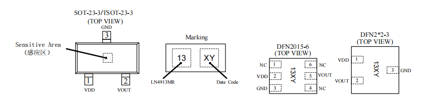 LN4913 是一款基于混合信號 CMOS 技術(shù)的無極性霍 爾開關(guān),這款 IC 采用了先進(jìn)的斬波穩(wěn)定技術(shù),因而能夠提 供準(zhǔn)確而穩(wěn)定的磁開關(guān)點(diǎn)。 在電路設(shè)計(jì)上,LN4913 提供了一個內(nèi)嵌的受控時鐘機(jī) 制來為霍爾器件和模擬信號處理電路提供時鐘源,同時這個 受控時鐘機(jī)制可以發(fā)出控制信號使得消耗電流較大的電路周 期性的進(jìn)入“休眠”模式;同樣通過這個機(jī)制,芯片被周期 性的“喚醒”并且根據(jù)預(yù)定好的磁場強(qiáng)度閾值檢測外界穿過 霍爾器件磁場強(qiáng)度的大小。如果磁通密度高于“操作點(diǎn)”閾 值或者低于“釋放點(diǎn)”閾值,則開漏輸出晶體管被驅(qū)動并鎖 存成與之相對應(yīng)的狀態(tài)。而在“休眠”周期中,輸出晶體管 被鎖定在其先前的狀態(tài)下。在電池供電應(yīng)用中,這種設(shè)計(jì)對 于延長工作壽命提供了最好支持。 LN4913 的輸出晶體管在面向封裝標(biāo)示一面存在一定強(qiáng) 南極或北極磁場時被鎖定在開狀態(tài),而在無磁場時鎖定在關(guān) 狀態(tài)。